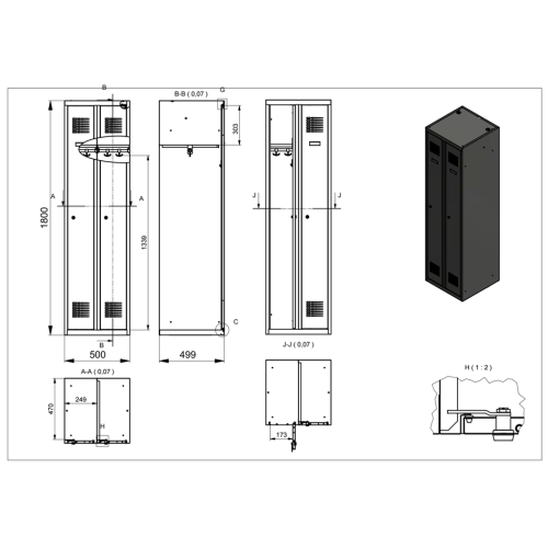 Az ajtók perforációval vannak ellátva a belső tér hatékony szellőzése érdekében. A zárást két kulccsal rendelkező hengerzár biztosítja, amely kiválóan alkalmas üzemi vagy ideiglenes létesítményekbe.