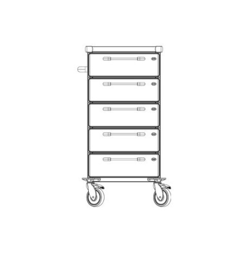 A kocsi kivitelezése lehet acél, szürke antimikrobiális felületkezeléssel vagy rozsdamentes acél, AISI304. A kocsi rezonancia gátló merevítéssel rendelkezik. A kocsi munkafelülete AISI304 rozsdamentes acélból készül, enyhe bemélyedéssel, védősarkokkal és 20 kg teherbírással. A fiókok előlapja kompakt műanyagból (ABS) készül, színe a színmintából választható. A fiókok kialakítása MS kosarak tárolására. Az MS fiókok elválasztókkal oszthatók. A fiókok teljesen kihúzhatók és golyós fióksínnel vannak felszerelve. Fiók teherbírás 10 kg. A fiókok központilag zárhatók. A termék felszereltsége: 5 x ¾ M méretű fiók (magasság 120 mm). A kocsi AISI304 acél fogantyúkkal is fel van szerelve. A kocsi kerekei műanyagok, műanyag ütközőkkel. A kerekek átmérője 125 mm, ebből 2 fékezhető. A termék teljes terhelhetősége 150 kg.