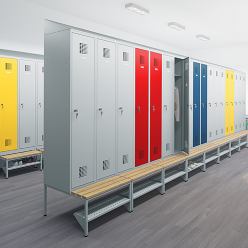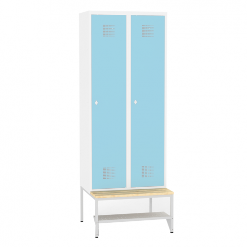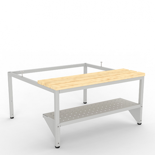 Perforált, 300 mm széles, cipőtartó polc ülőpadhoz az öltözőszekrény alá. Használatuk előnye, hogy a szekrények alatt lehetséges a felmosás, és a lábbelik nem a padlón vannak elhelyezve. A polc utólag is felszerelhető az általunk szállított ülőpadokra, rögzítés csavarokkal.