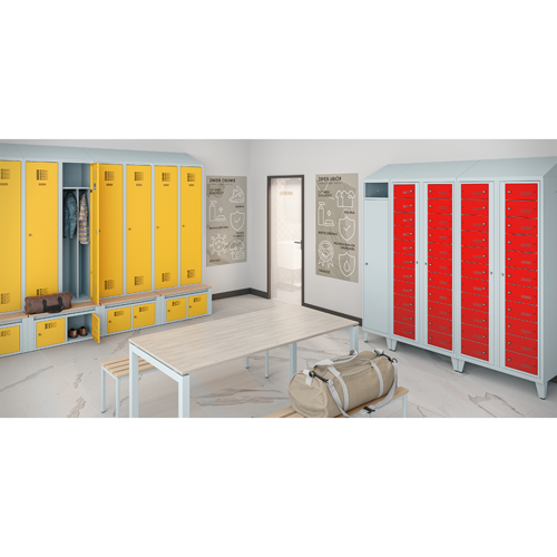 Kisrekeszes fémszekrény ülőpaddal, elsősorban a cipők biztonságos tárolására. Az ajtó alapfelszereltségként cilinderzárral van ellátva, igény szerint lakatkilincsel, vagy felár ellenében más típusú zárás is lehetséges megrendelni. Minden zárhoz 2 kulcs a készletben. Kérésre az öltözőszekrény és a cipőtartó szekrény azonos kulccsal is rendelhető, ekkor ugyanaz a kulcs nyitja mindkét szekrény ajtaját. A szekrény belső méretei (Ma x Sze x Mé): 285 x 173 x 400 mm.