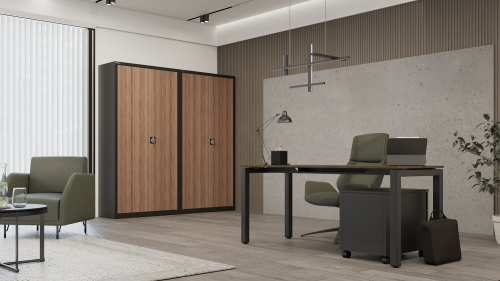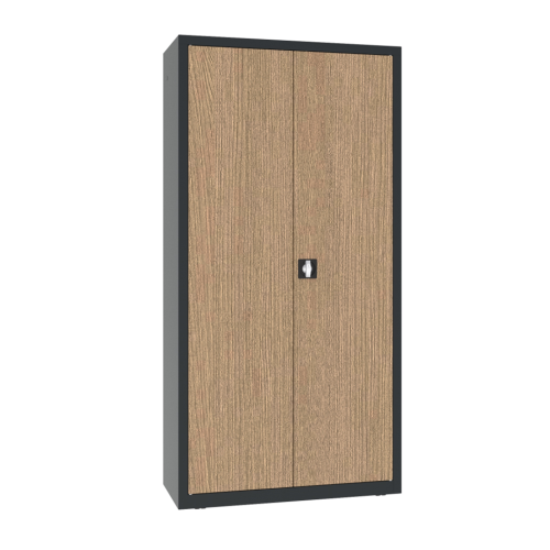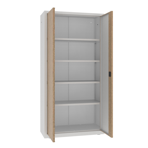 A szekrény a fém tartósságát a természetes fa eleganciájával ötvözi, így praktikus megoldást kínál minden helység számára. Három sokoldalú fa furnér változatban kapható: Teak, Tölgy és Dió, amelyek utánozzák a valódi fa textúráját és melegségét. A neutrális színű, finom textúrájú laminát tökéletesen illeszkedik mind a hagyományos, mind a modern belső terekbe. A fa megjelenésű furnérok természetes árnyalatai lehetővé teszik a szekrény egyszerű összehangolását különféle design stílusokkal, kiemelve bármely helyiség karakterét. A szekrény alkalmazható irodákban, egészségügyi intézményekben, dolgozószobákban vagy szállodákban, egyszóval mindenhol, ahol fontos a praktikusság és az időtlen design kombinációja. Ez egy olyan megoldás, amely a minimalista formát, a funkcionalitást és az eleganciát ötvözi, tökéletesen illeszkedve a professzionális használat igényeihez.