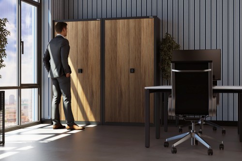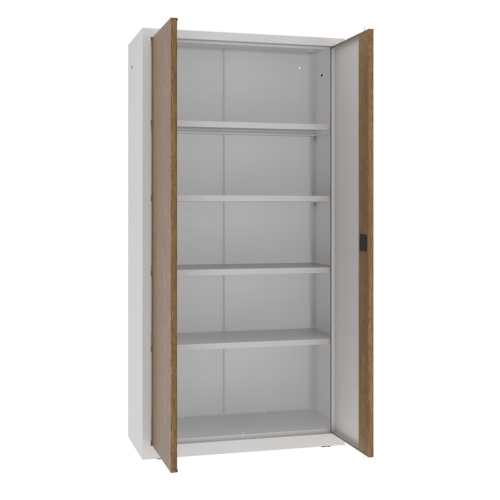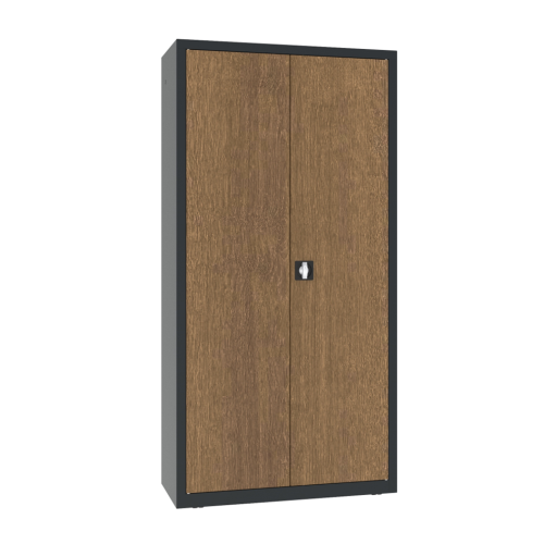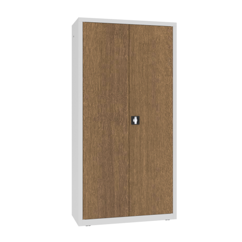 A szekrény a fém tartósságát a természetes fa eleganciájával ötvözi, így praktikus megoldást kínál minden helység számára. Három sokoldalú fa furnér változatban kapható: Teak, Tölgy és Dió, amelyek utánozzák a valódi fa textúráját és melegségét. A neutrális színű, finom textúrájú laminát tökéletesen illeszkedik mind a hagyományos, mind a modern belső terekbe. A fa megjelenésű furnérok természetes árnyalatai lehetővé teszik a szekrény egyszerű összehangolását különféle design stílusokkal, kiemelve bármely helyiség karakterét. A szekrény alkalmazható irodákban, egészségügyi intézményekben, dolgozószobákban vagy szállodákban, egyszóval mindenhol, ahol fontos a praktikusság és az időtlen design kombinációja. Ez egy olyan megoldás, amely a minimalista formát, a funkcionalitást és az eleganciát ötvözi, tökéletesen illeszkedve a professzionális használat igényeihez.