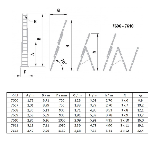 Háromrészes alumínium létra professzionális használatra. A 7606 és 7610 típusok 2 különálló létrára oszthatók. A létra 3 x 6-tól 3 x 12 lépcsőfokig terjedő változatokban kapható. Terhelhetősége 150 kg. Az áru általában gyorsan kiszállítható.