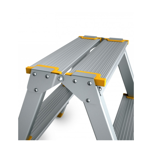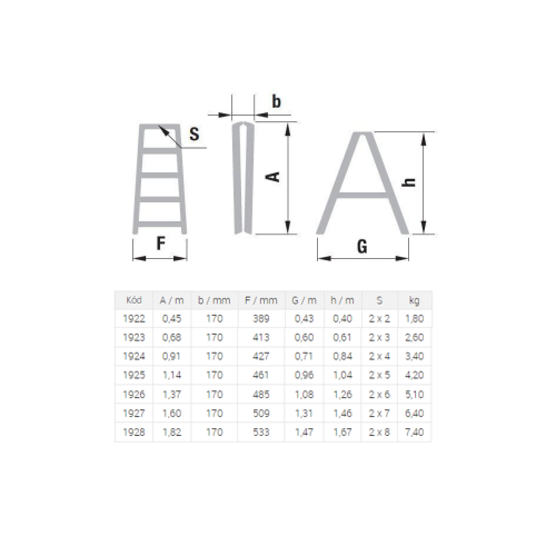Lépcsőfokok száma 2-től 8-ig. Kétoldalas alumínium fellépő lépcső otthoni használatra. Az egyes változatok paramétereit lásd. táblázat a termékképek között. A termék teherbírása 150 kg.