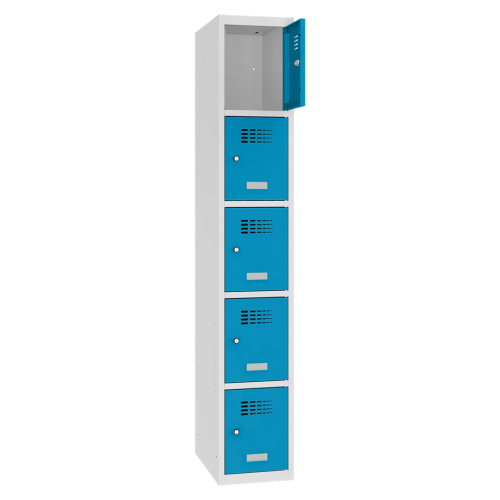 Fémszekrény kis rekeszekkel, 2 kulccsal minden ajtóhoz a készletben. Az összes ajtón szellőző nyílásokkal és öntapadós névtáblatartóval. A szekrény tökéletesen megfelel kisebb tárgyak megőrzésére.