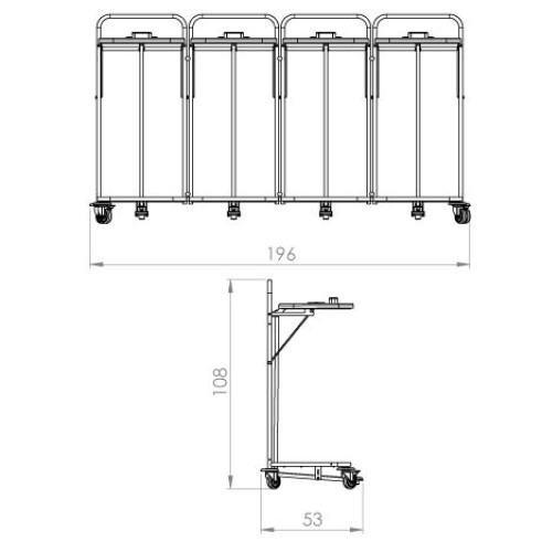 Fém szerkezetű kocsi, felülete szürke antimikrobiális festékkel van kezelve. A műanyag fedelek lábbal nyithatók, pedál segítségével. Választható műanyag elemek színei: piros, kék, zöld, sárga. A zsáktartó lehajtható: 4 x 120 l, teherbírás 15 kg. A műanyag kerekek, ütközőkkel vannak felszerelve, átmerőjük 75 mm, 2 fékezhető. A termék teljes teherbírása 60 kg.