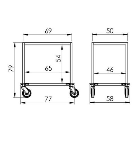 Szállítókocsi AISI304 rozsdamentes acélból. A kocsi tároló felületei 12 mm-es bemélyedéssel, 50 kg teherbírással és rezonancia gátló merevítéssel készülnek. A termék teljes teherbírása 100 kg. A kerekek műanyagok, puha futófelülettel, amely nem hagy nyomot, és ütközőkkel is fel vannak szerelve. A kerekek átmérője 125 mm, ebből 2 db fékezett.