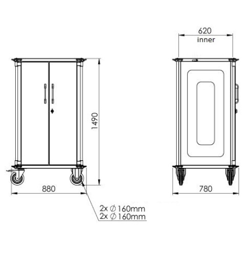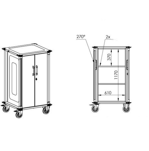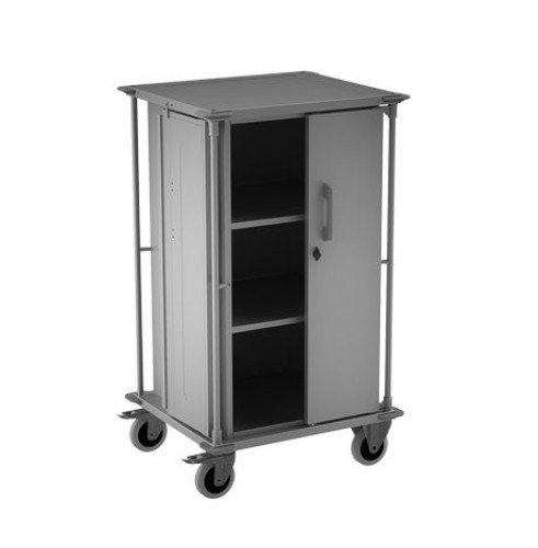 A kocsi kivitelezése rozsdamentes acél, AISI304. A kocsi duplafalú, porálló és zárható ajtóval rendelkezik, 270°-os nyitási szöggel. Az ajtók körül tömítés található és az ajtók nyitott helyzetben rögzíthetők. A kocsi 2 állítható polccal van felszerelve, amelyek teherbírása 60 kg. A kapacitás 6 konténer (méretek 300 x 600 x 300 mm). A kocsi mindkét oldalán függőleges fogantyúkkal rendelkezik. A kerekek horganyzottak, szürke futófelülettel, 2 x forgó kerék, fékkel felszerelve és műanyag ütközőkkel.
