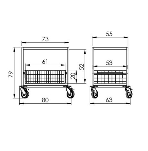 Szállítókocsi AISI304 rozsdamentes acélból. A kocsi tároló felületei 12 mm-es bemélyedéssel és 50 kg teherbírással rendelkeznek. Ezen kívül a kocsi mindkét oldalról kihúzható kosárral rendelkezik. A kosár magassága 200 mm, teherbírása 15 kg. A termék teljes teherbírása 65 kg. A kocsi rezonancia gátló merevítéssel készül. A kerekek műanyagok és ütközőkkel is fel vannak szerelve. A kerekek átmérője 125 mm, ebből 2 db fékezett.