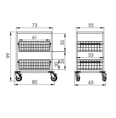 Szállítókocsi AISI304 rozsdamentes acélból. A kocsi tároló felületei 12 mm-es bemélyedéssel és 50 kg teherbírással rendelkeznek. Ezen kívül a kocsi mindkét oldalról kihúzható kosarakkal rendelkezik. A kosár magassága 200 mm, teherbírása 15 kg. A termék teljes teherbírása 80 kg. A kocsi rezonancia gátló merevítéssel készül. A kerekek műanyagok és ütközőkkel is fel vannak szerelve. A kerekek átmérője 125 mm, ebből 2 db fékezett.