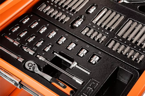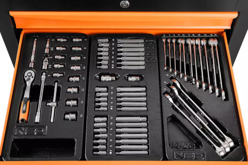Műhelykocsi 7 fiókkal + 176 szerszámmal. 680 x 460 x 1030 mm méretű, 280 kg teherbírású kiegészítő szekrény. Robusztus acélvázzal, központi zárral, gumibéléssel a tetején és golyóscsapágyas hosszabbítókkal rendelkezik. Könnyen szállítható a zárható PVC kerekeknek, azok 5” átmérőjének és az oldalsó fogantyúnak köszönhetően. A tartalmat két kulcs biztosítja. A szekrényt válogatott betétekkel kínáljuk, alkatrészszámokkal: Ez egy átfogó készlet, amely a legtöbb mechanikai javításhoz szükséges elemet tartalmazza: