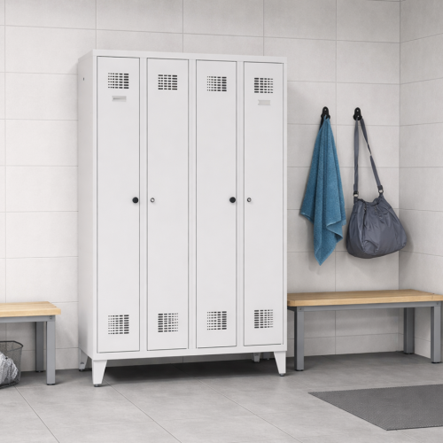 Az WZD 341 modell hatékony megoldást kínál az öltözőhelyiségek berendezésére. Egyetlen szekrénytestben négy ruházati rekeszt biztosít, miközben megőrzi az átláthatóságot, a robusztus felépítést és az egységes designt.