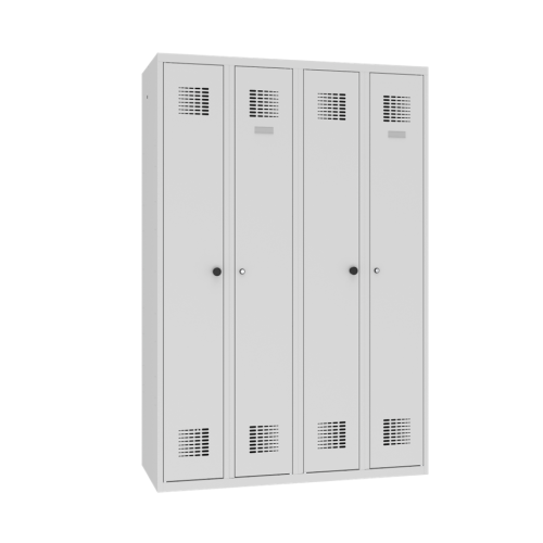 Minden ajtópár egy közös hengerzárral zárható, ami azt jelenti, hogy a szekrény összesen két független zárrendszerrel rendelkezik. Ez a megoldás különösen praktikus olyan üzemekben, ahol a szekrényeket központilag kezelik, de az egyes rekeszeket különböző felhasználók használják. Az ajtók perforáltak, biztosítva a tárolt ruhák természetes szellőzését.