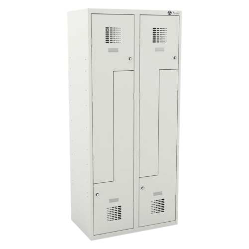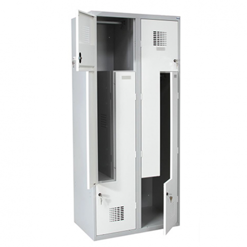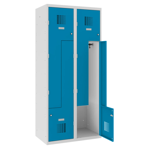 Standard fém öltözőszekrény Z-ajtóval, ill. L-ajtóval és 2 kulccsal minden ajtóhoz a készletben. Az összes ajtón szellőző nyílásokkal és öntapadós névtáblatartóval. A szekrény helytakarékos és megfelel a hosszú kabátok megőrzésére is.
