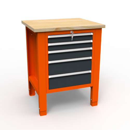 Fém műhelyasztal, 725 mm széles. A magassága állítható 850 - 900 mm. Az asztal teherbírása 300 kg. Az asztallap keményített lemezelt fatábla, felár ellenében rendelhető más asztallappal is. A munkapadot lapra szerelt állapotban szállítjuk.