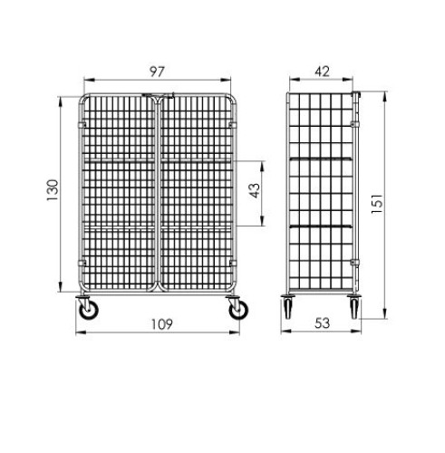 Rácsos szállító kocsi horganyzott kivitelben. A kocsi felszereltsége: 1 x oldalsó ajtó, 2 x állítható polc, teherbírás 70 kg. A kocsi 4 x 125 mm átmérőjű forgó kerékkel van felszerelve és műanyag ütközőkkel. A termék teljes teherbírása 300 kg. A kocsi felár ellenében felszerelhető gyűjtő zsákokkal is.
