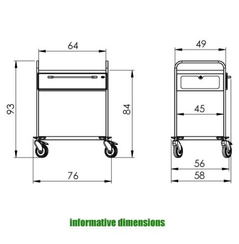 Fém kocsi AISI304 rozsdamentes acélból. A kocsi váza rezonancia gátló merevítéssel készül. A kocsi felszereltsége: 2 x tároló felület 12 mm-es bemélyedéssel, 50 kg teherbírással, 1 x M méretű fiók (magassága 120 mm), teherbírása 20 kg. Az MS fiókok porállóak, belsőjük elválasztókkal osztható. A fiókelőlapok kompakt ABS műanyagból készülnek, színük választható, lásd. termékképek. A fiókok központilag zárhatók. A kerekek forgathatók, műanyag ütközőkkel vannak felszerelve, átmérőjük 125 mm, ebből 2 fékezhető. A termék teljes teherbírása 120 kg.