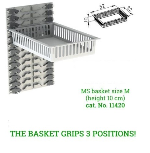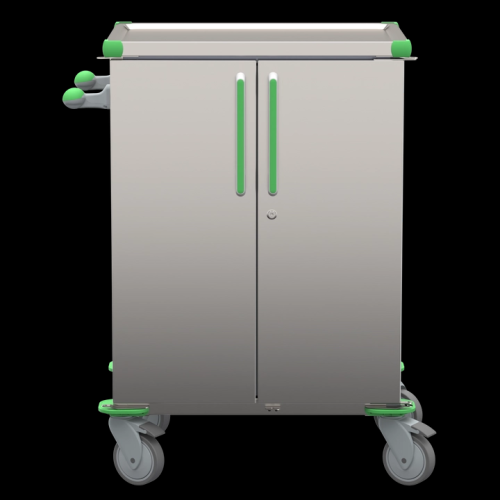 Fém polcos kocsi AISI304 rozsdamentes acélból. A váz rezonancia gátló merevítéssel. A kocsi felső munkafelülete 12 mm-es bemélyedéssel rendelkezik és védősarkokkal van ellátva, teherbírása 20 kg. Az ajtó zárható és porálló. A belső elrendezés ISO kosarak tárolására, a pozíciók száma 14. A kosarakat külön kell megrendelni, nem képezik a készlet részét, a megrendelő igénye szerint rendelhetők. A három fajta ISO kosár különböző számú pozíciót foglal el, lásd. termékgaléria. A kerekek átmérője 125 mm és műanyag ütközőkkel vannak ellátva, 2 kerék fékezhető. A termék terhelhetősége 150 kg.