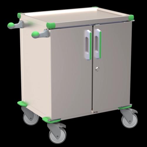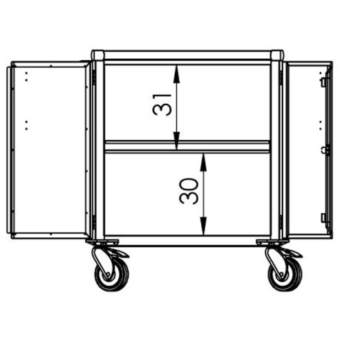 Fém polcos kocsi AISI304 rozsdamentes acélból. A váz rezonancia gátló merevítéssel. A kocsi felső munkafelülete 12 mm-es bemélyedéssel rendelkezik és védősarkokkal van ellátva, teherbírása 20 kg. Az ajtó zárható és porálló. Polcok száma: 2 x fix polc - a magasság nem állítható, teherbírás 30 kg. A kocsi rozsdamentes acél tolókarral is rendelkezik. A kerekek átmérője 125 mm és műanyag ütközőkkel vannak ellátva, 2 kerék fékezhető. A termék terhelhetősége 150 kg.