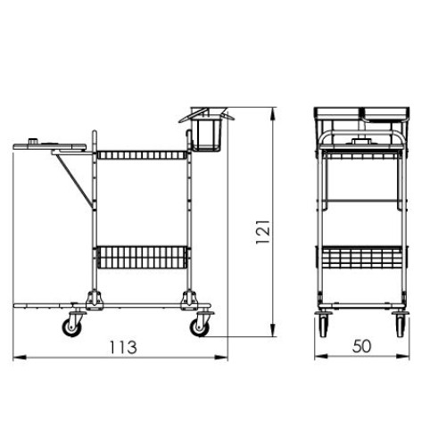 Fém kocsi króm vázzal. A kocsi felszerelése: 1 x 120 l lehajtható zsáktartó, 2 x 6 l vödör (piros, kék), 1 x műanyag fedél (rendelhető: piros, kék, zöld, sárga), 2 x kosár - teherbírás 20 kg. A kocsi forgó kerekekkel műanyag ütközőkkel felszerelve, 100 mm átmérő. A termék teljes teherbírása 100 kg.