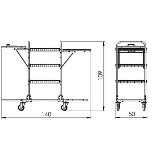 Fém kocsi króm vázzal. A kocsi felszerelése: 2 x 80 l zsáktartó, 2 x műanyag fedél (rendelhető: piros, kék, zöld, sárga), 1 x 120 l zsáktartó, 1 x műanyag fedél (rendelhető: piros, kék, zöld, sárga), 3 x drótkosár - teherbírás 20 kg. A kocsi forgó kerekekkel műanyag ütközőkkel felszerelve, 100 mm átmérő.