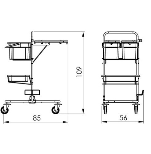 Fém kocsi króm vázzal. A kocsi felszerelése: 2 x 80 l zsáktartó, 2 x műanyag fedél (rendelhető: piros, kék, zöld, sárga), 1 x vödör tartó, 2 x 9 l vödör (rendelhető: piros, kék) - teherbírás 6 kg, 1 x tartály tartó, 1 x műanyag tartály - teherbírás 6 kg, 1 x mop tartó. A kocsi forgó kerekekkel műanyag ütközőkkel felszerelve, 100 mm átmérő. A termék teljes teherbírása 100 kg.