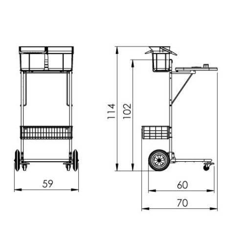 Fém kocsi króm vázzal. A kocsi felszerelése: 1 x 120 l lehajtható zsáktartó, 1 x műanyag fedél (rendelhető: piros, kék, zöld, sárga), 1 x kosár - teherbírás 6 kg, 1 x vödör tartó, 2 x 6 l vödör (piros, kék) - teherbírás 6 kg. Kerekek: 2 x fix (átmérő 195 mm), 2 x forgó kerék ütközővel (átmérő 50 mm). A termék teljes teherbírása 50 kg.