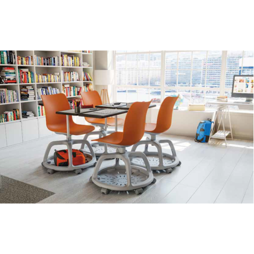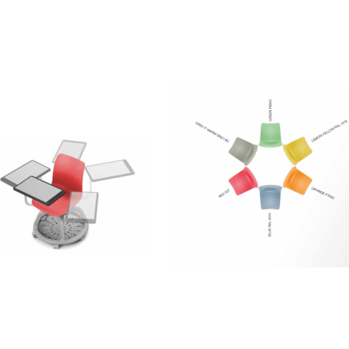 Szék diákoknak műanyag üléssel, kisasztallal és görgőkkel. Az ülés a tengelye körül forgatható, és a színét különböző árnyalatok közül választhatja ki, lásd. termékképek. Az asztal a szék körül és tengelye körül is forgatható. Az ülés alatt van egy tárolóhely, például egy iskolatáska számára. A szék 6 x 50 mm átmérőjű görgőkkel van felszerelve. A szék teherbírása 120 kg