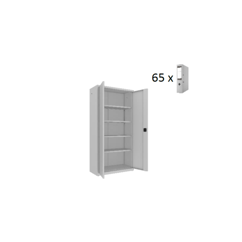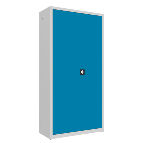 Zárható polcos fémszekrény szárnyasajtókkal, 1990 x 1000 x 435 mm. A szekrény 2 db kulccsal és 4 db polccal kerül kiszállításra. A polcok 25 mm-ként alíthatók.