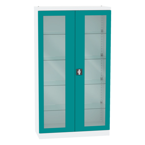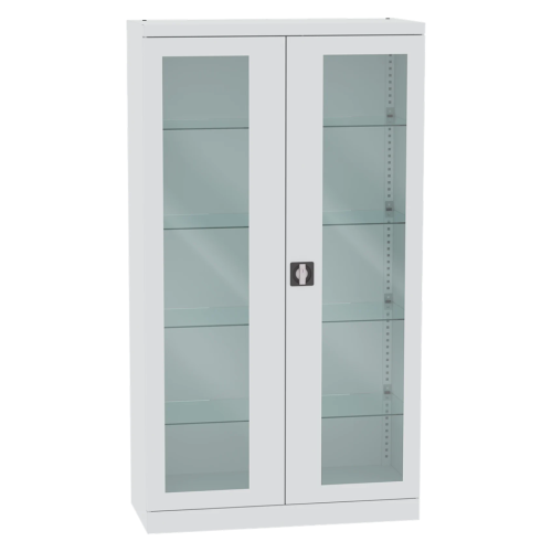 Üvegajtóval ellátott fémszekrény. Részletes leírás
