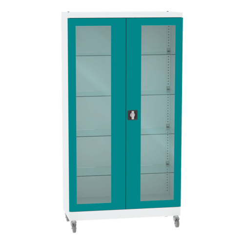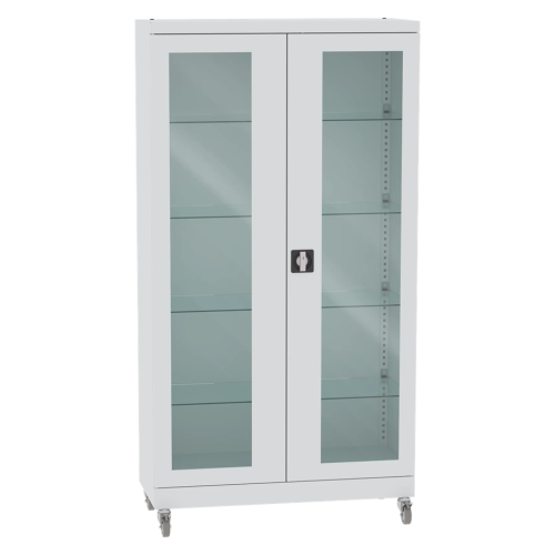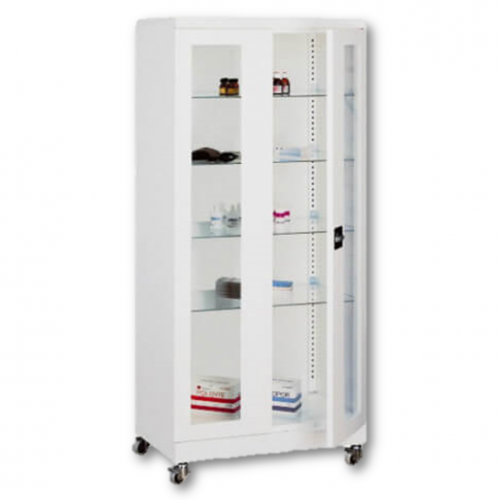 Betekintő ablakos fém gyógyszerszekrény kerekekkel, 1000 mm széles. Az ajtó és polc edzett biztonsági üvegből. A kórházi szekrények zárhatók és 2 kulccsal kerülnek kiszállításra. Rendelhetők speciális antibakteriális szinterezéssel is felár ellenében.